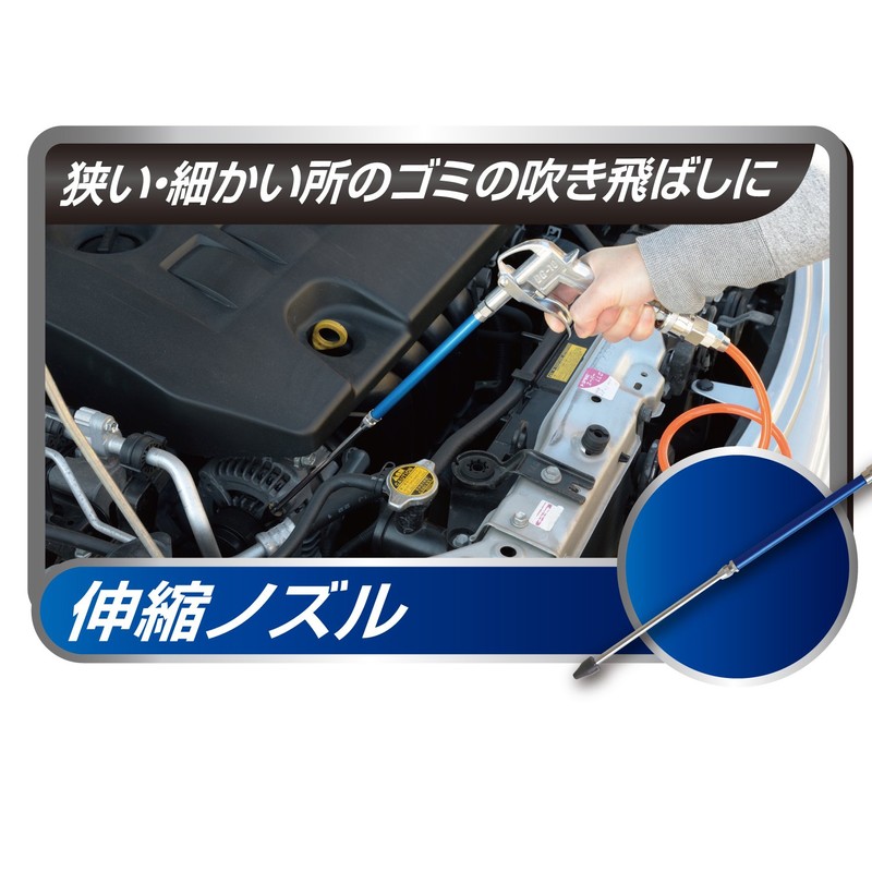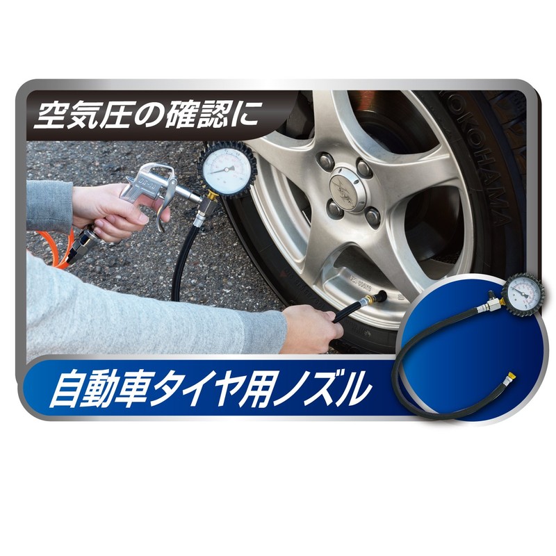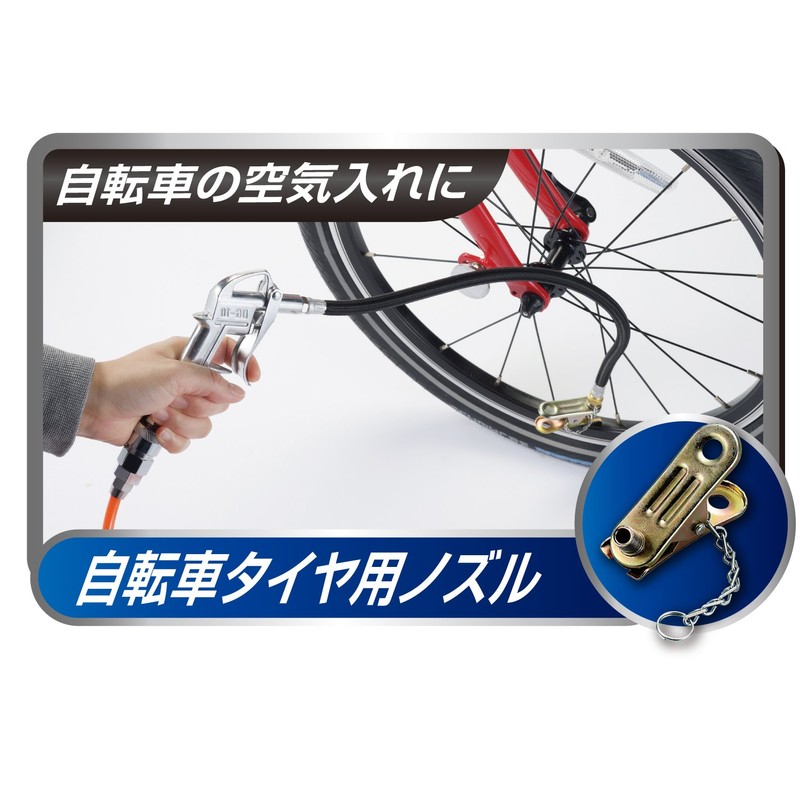 - Set Includes: Automotive tire nozzle, air hose (approx. 16.4 ft (5 m)), bicycle tire nozzle, air duster, ball nozzle, telescopic nozzle, rubber boat nozzle