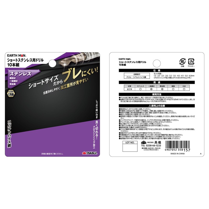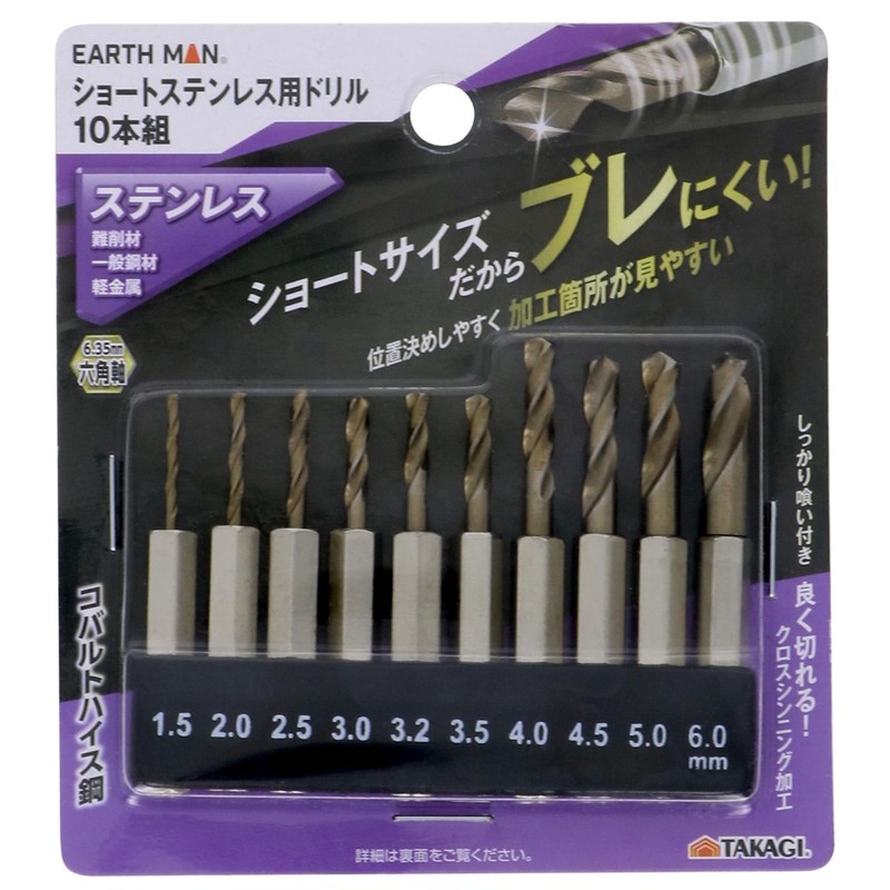 Takagi EARTH MAN Short Stainless Steel Drill Set of 10, 0 Piece Set, 0.25 inches (6.35 mm), Hex Shaft, Short Size, Easy to Position, Easy to See Processed Parts, Cross Thinning, Cobalt High Speed