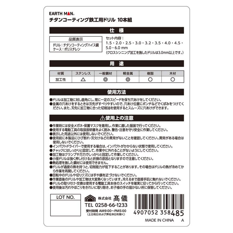 Takagi EARTH MAN Titanium Coated Ironwork Drill, Hex Shaft, Set of 10