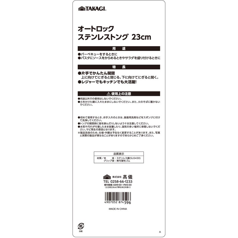 Takagi TAKAGI Auto Lock Stainless Steel Tongs, 9.1 inches (23 cm), Takagi