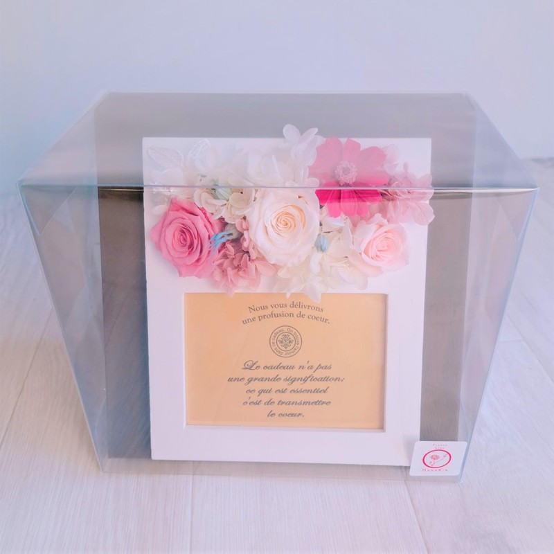 - Preserved Flower Gift Photo Frame with Clear Box Cellophane Wrapped and Ready for Gift Giving Flower Material: Rose, Hydrangea, Jinia; Product Size: Height 7.1 inches (18 cm), Width 6.3 inches (16 cm), Depth 5.9 inches (15 cm); Box Size: Height 8.7 inches (22 cm), Width 7.9 inches (20 cm), Depth 5.3 inches (13.5 cm); Elegant and gorgeous specifications
