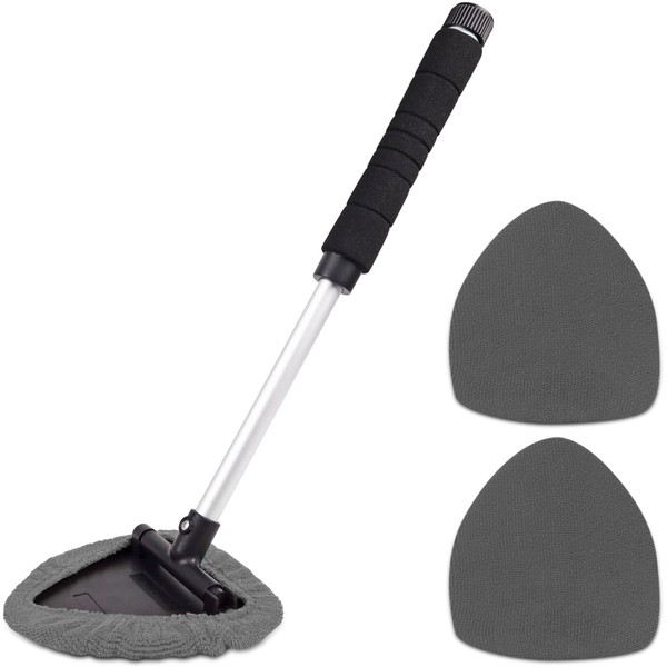 TAKAVU Car Window Cleaning Tool, Windshield Wiper Cleaner with Extendable Long-Reach Handle, 3 Washable Reusable Microfiber Bonnets, Car & Home Inside Interior Exterior Use - Lint Free (Grey)