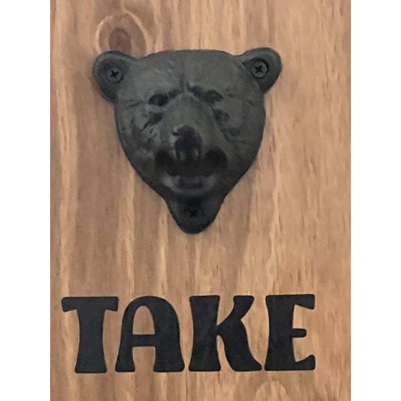 - Hand-made with an iron bear cap opener which hangs on a wall