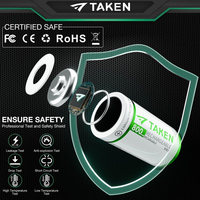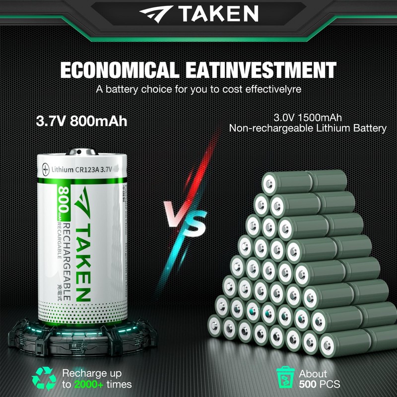 - HIGH-CAPACITY, LONG-LASTING BATTERIES.Includes CR123A 3.7V lithium batteries with 800mAh capacity, supporting up to 500 recharge cycles. Ideal for high-energy-demand devices such as flashlights, cameras, alarm systems, and smart home devices.