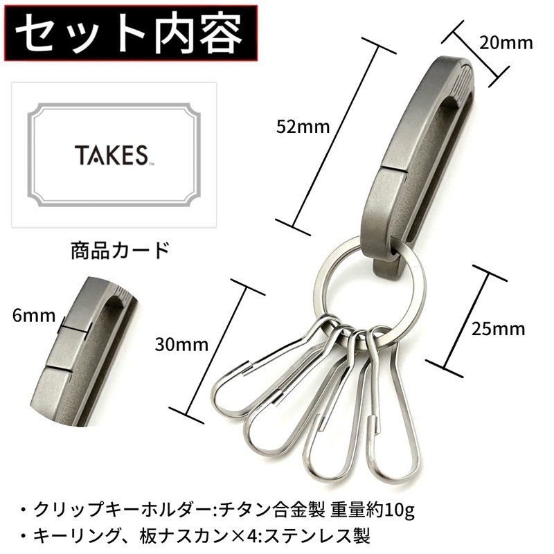 - Set Contents: Clip key holder (made of titanium alloy), key ring (stainless steel), plate knob x 4 (stainless steel), product card included. This product is not intended for mountain climbing