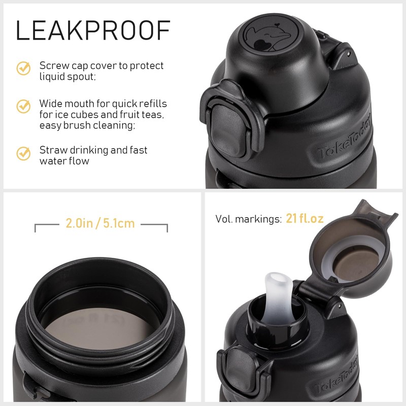 - [Leak Proof] The innovative sealing screw cap on this lightweight water bottle keeps spills and leaks out of the way and safeguards the bottle from opening unintentionally. This packable water bottles for travel has a tight seal and won't leak. It is easy to clean because of the wide-mouth design. It is very simple to refill our collapsing water bottle with ice cubes, fruits, and other beverages. We suggest cleaning it with boiled water or a lemon before using it for the first time
