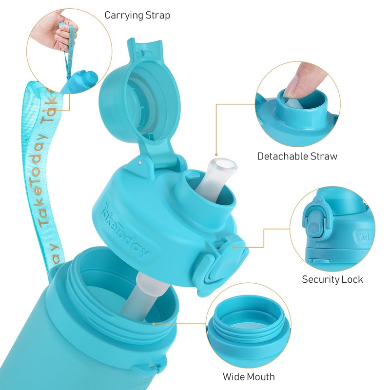 - [Sturdy] The TakeToday collapsible water bottle is composed of high-quality food grade silicone. Unlike glass cups and plastic bottles, which are easily broken, the bottle body is soft and robust, able to withstand dropping, squashing, smashing, and hits, so you can enjoy using it without worry