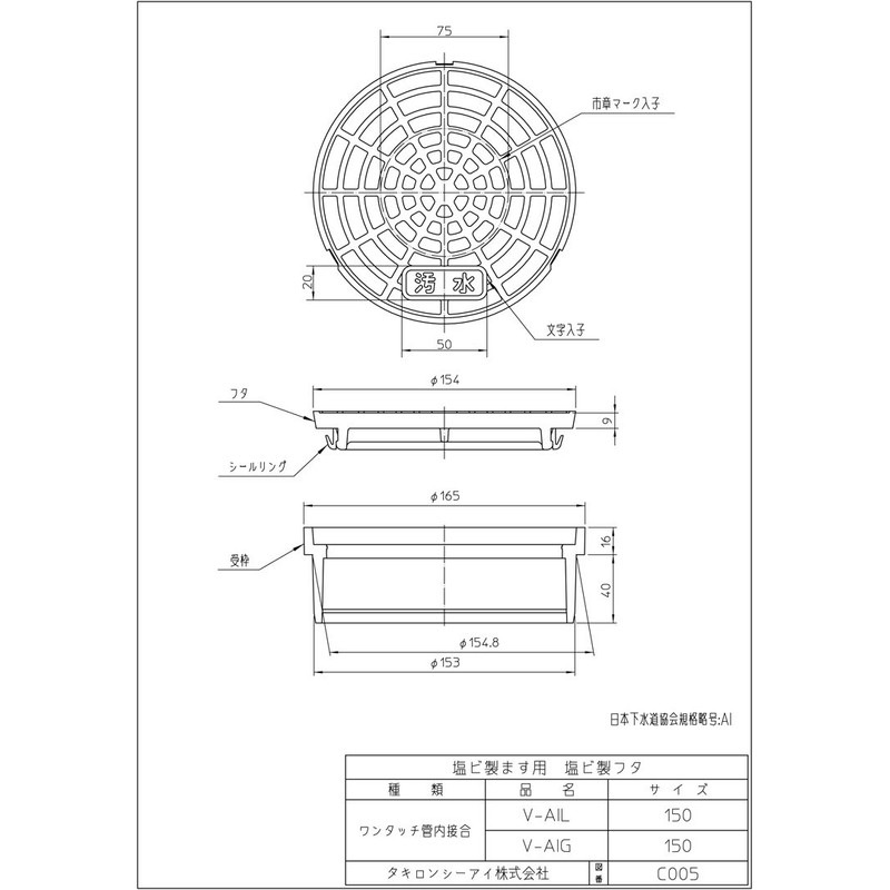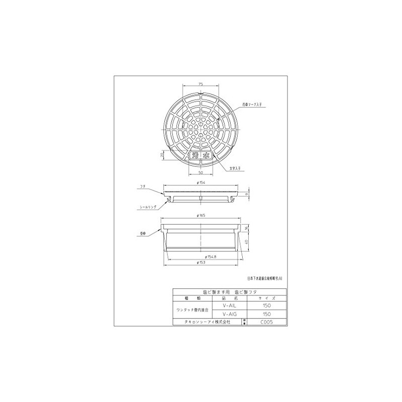Takiron CI V-AIL Sewage Lid, Light, 150 Size, PVC Lid, Tube Inseam, AI Manufacturer Model Number: 305662