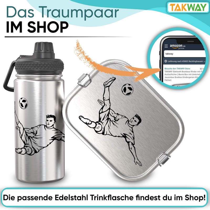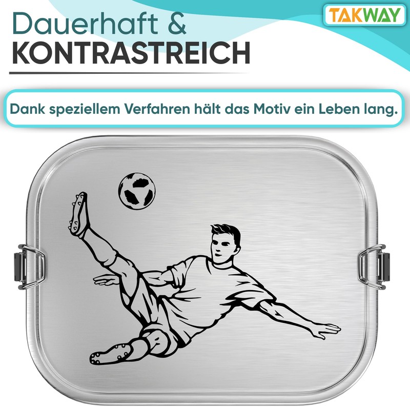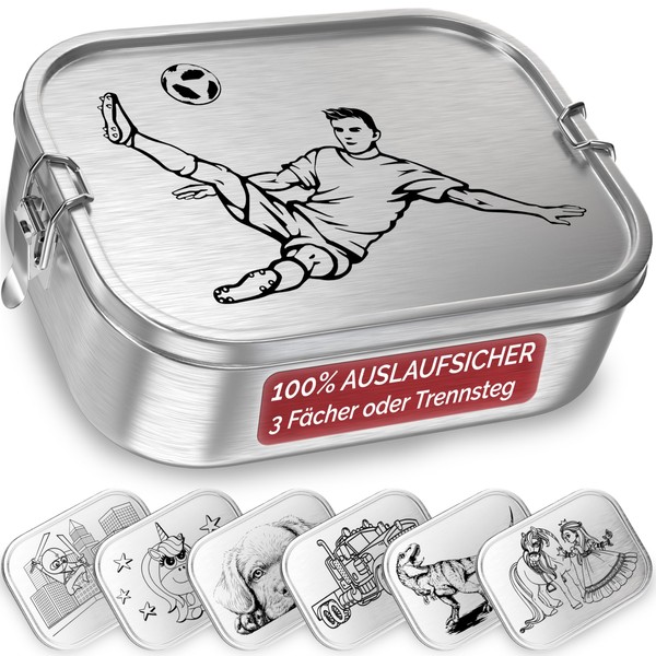 TAKWAY Children's Stainless Steel Lunch Box with Compartments, 800 ml, Leakproof Bento Box, Adjustable, Snack Box, Lunch Box, Nursery, School (Football, Divider)