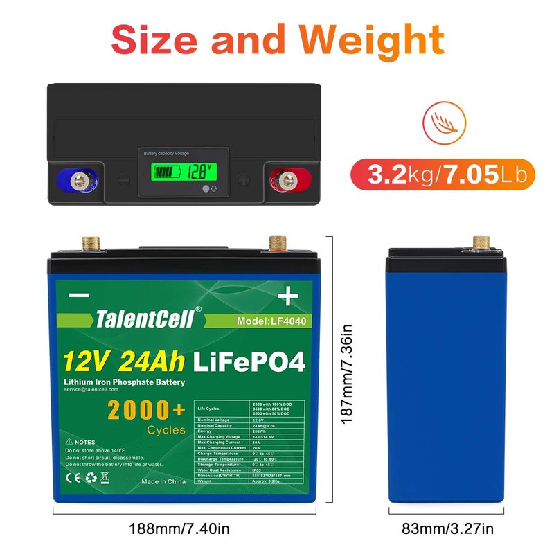 TalentCell 12V 24Ah LiFePO4 Battery Pack LF4040, 12.8V 288Wh Deep Cycle Rechargeable Lithium Iron Phosphate Batteries