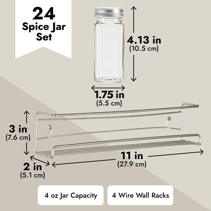 - Spice Rack with Jars and Labels: Our all-in-one clear spice jars and rack set comes with wall-mount spice racks, empty square glass spice jars, airtight silver metal caps, coarse shakers, and more