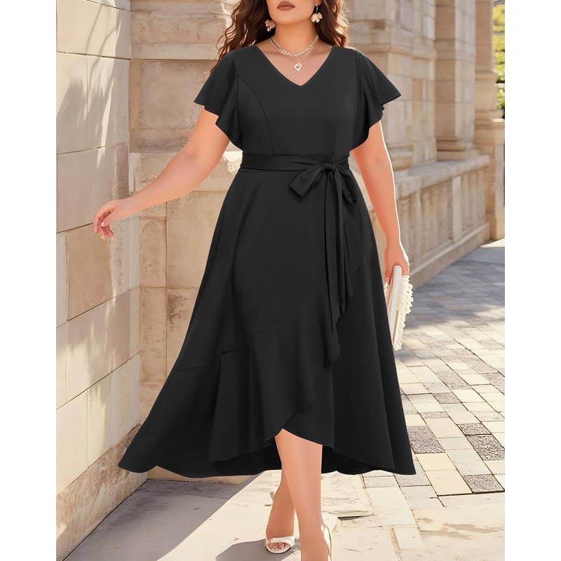 - Features: This plus-size dress features a V-neck, ruffled short sleeves, an empire waist, a ruffled high-low hemline, a waist belt, and a high-waist design, all of which help showcase your beautiful body curves.