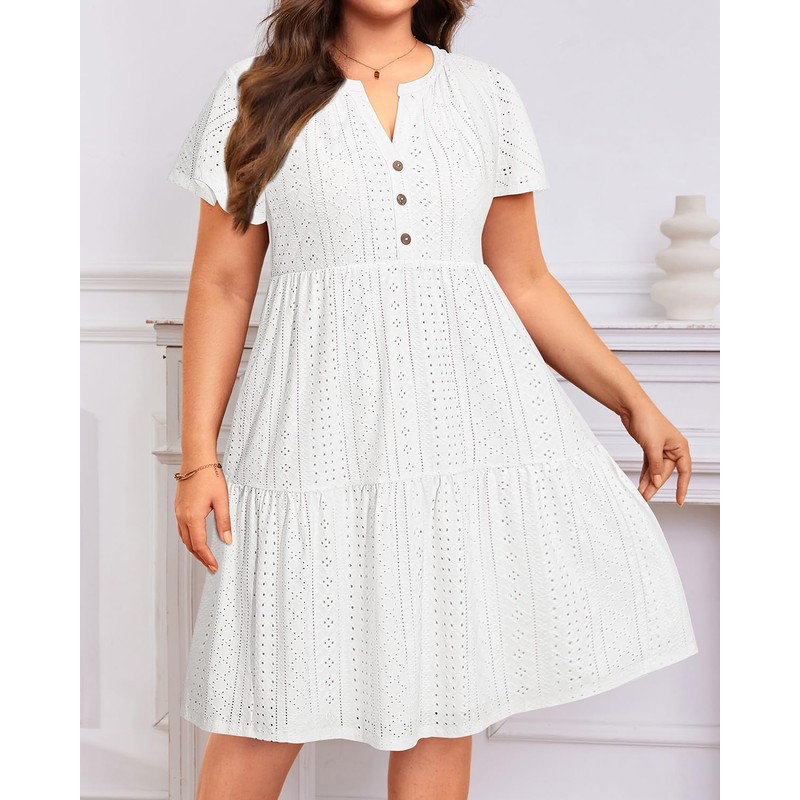 Talisea Plus Size White Dress Eyelet Summer Casual Beach Graduation Short Sleeve Ruffle Tiered Button Boho Sundress Women