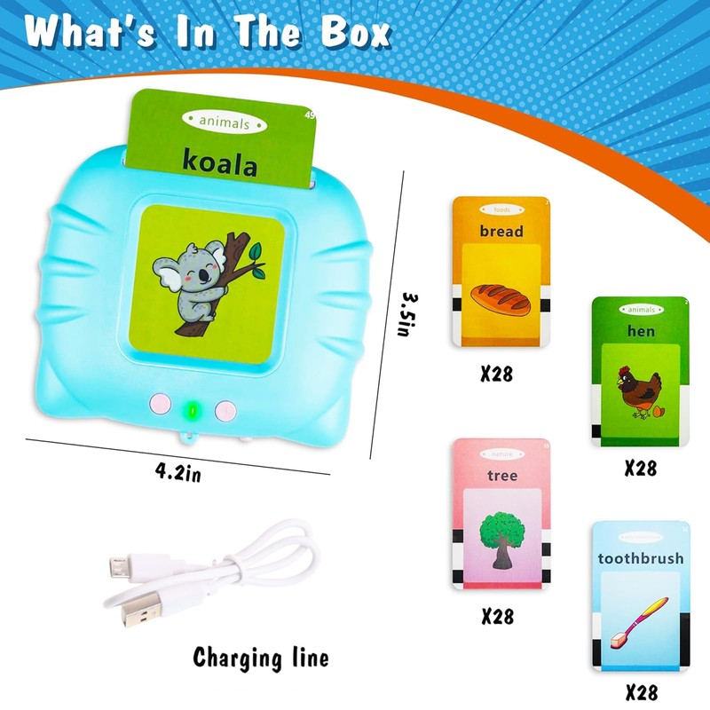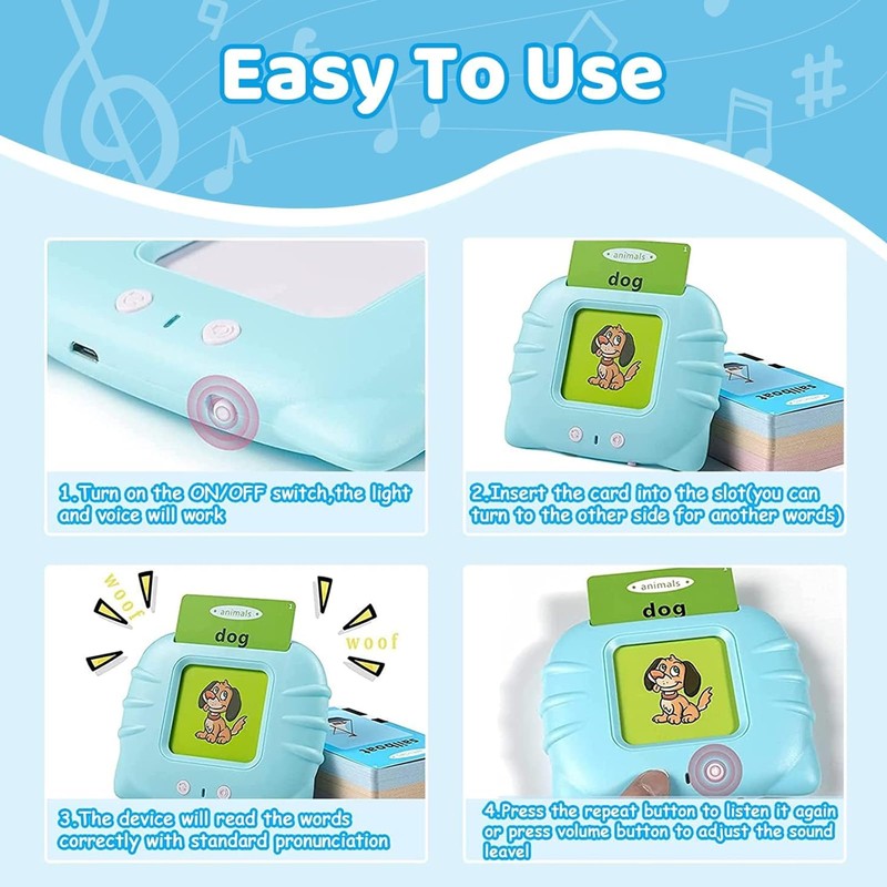 - INTERESTING LEARNING EXPERIENCE WITH TALKING FLASHCARDS: This early educational toys With standard pronunciation, the voice is loud and clear. Great for toddlers who are trying to learn basic words and toddler who is speech delayed. humorous and cute pictures, and automatic pronunciation functions can effectively attract toddlers' attention and stimulate interest in learning