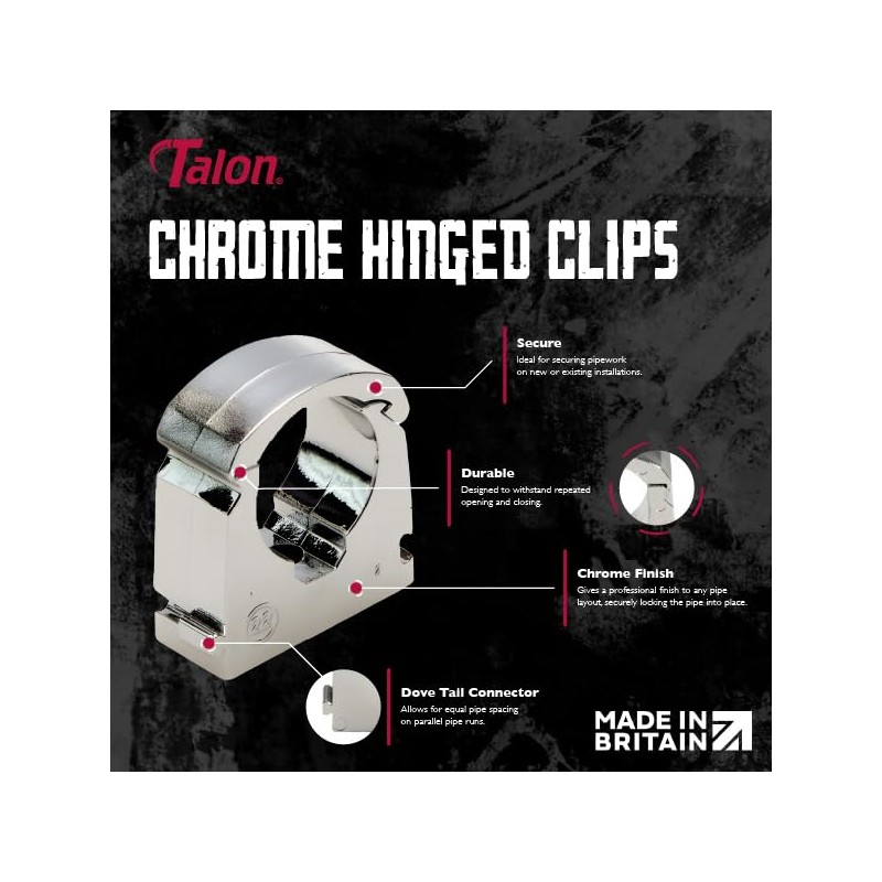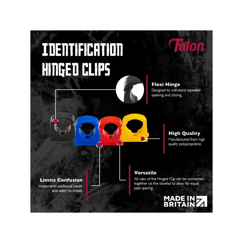 • SINGLE HINGED PIPE CLIP: Talon has been manufacturing the 'Talon Hinged Clip' for over 30 years, hence it's one of our best selling products. Produced in the UK, the Single Hinged Pipe Clip has been designed to suit all domestic pipework installations, making it an incredibly versatile, universal plumbing pipe clip