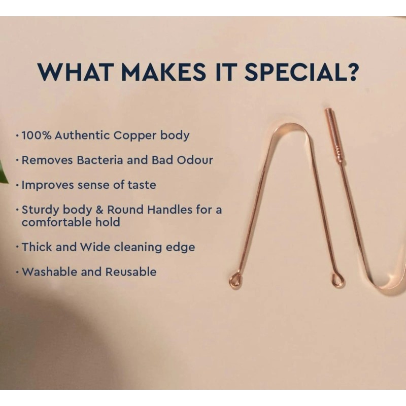 A copper tongue scraper is an oral hygiene tool made from copper, designed to remove food particles, and dead cells from the surface of the tongue. Its use helps to improve overall oral health, enhance taste sensation, and reduce bad breath. Copper is chosen for its ayurvedic properties . The scraper typically has a curved, ergonomic shape to effectively reach the back of the tongue and is easy to clean and maintain. Regular use of a copper tongue scraper can contribute to a cleaner mouth and fresher breath.