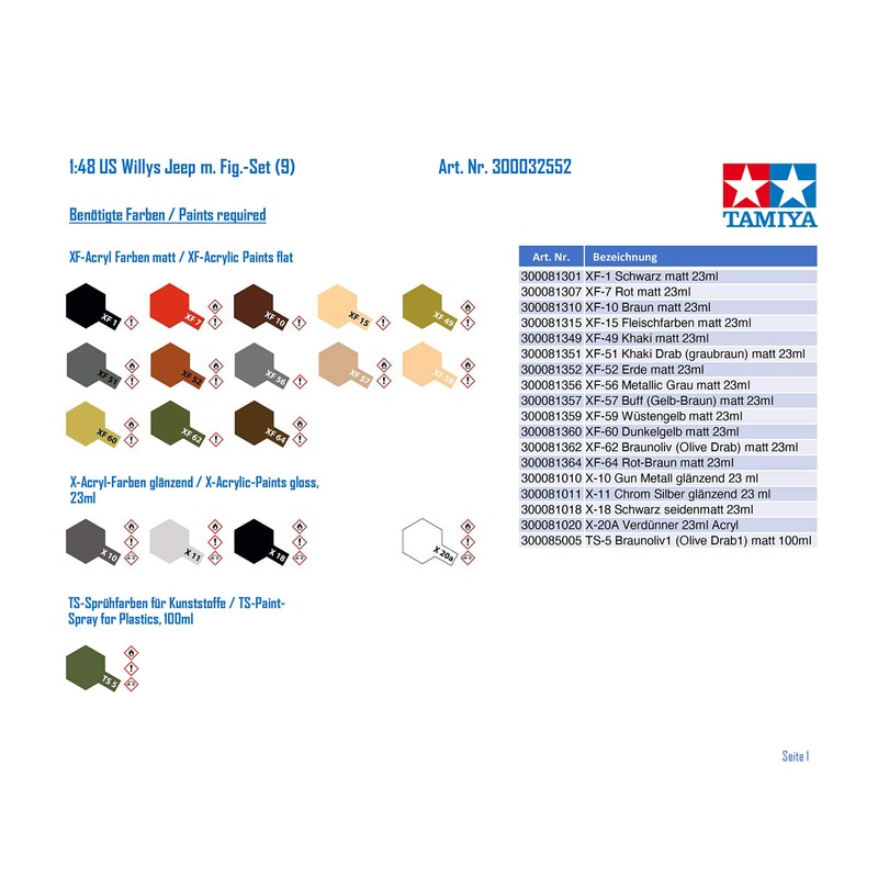 9 figures in casual poses (including 2 generals) with separately molded equipment and weapons as applicable. Includes blitz cans (x4), jerry cans (x4), fuel drums (x3), rolled canvas (x2), sleeping bag, duffel bag, barracks bag, ammunition bags (x3), field bags (x3). Also Features Willys Jeep with detailed chassis and interior.