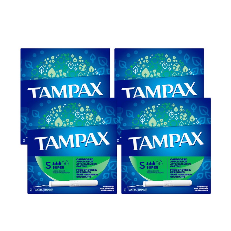 Tampax Tampons, Super Absorbency, Cardboard Applicator, Leakgaurd Skirt, Unscented, 20 Count X 4 Packs (80 Count Total)