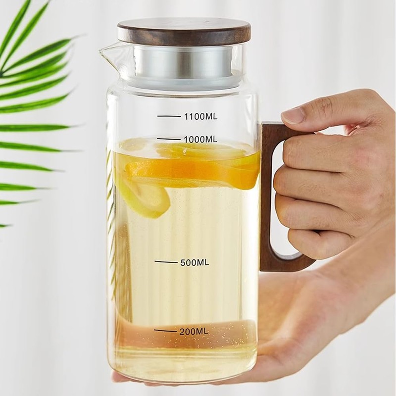 TAMUME 1.5L Borosilicate Glass Water Pitcher with Wooden Lid and Handle