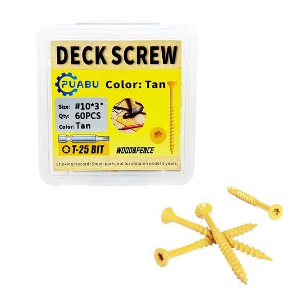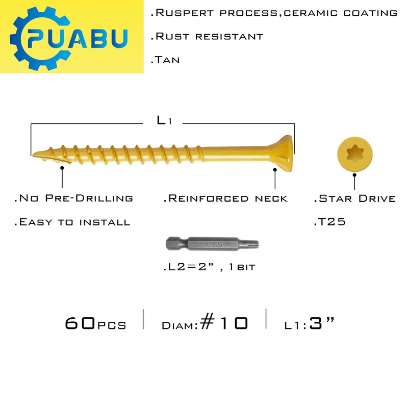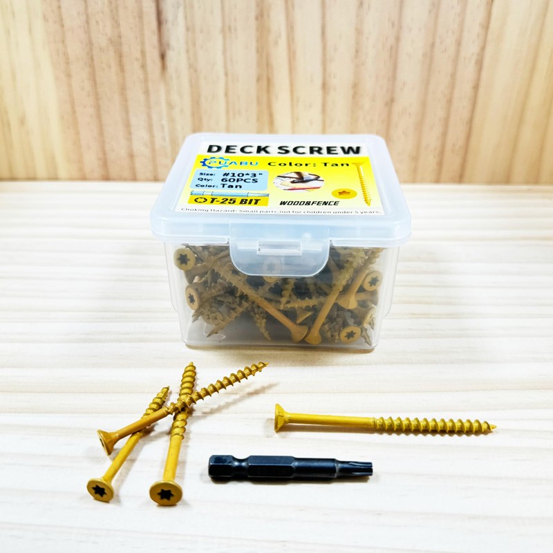Tan#10 * 3"*60pcs.Box Deck Screws, epoxy Coating, Rust-Proof, Torx/Star Drive Head Deck Screws, T25 Star Drill Head, Brown, Send T-25 Star Drive Drill bit.