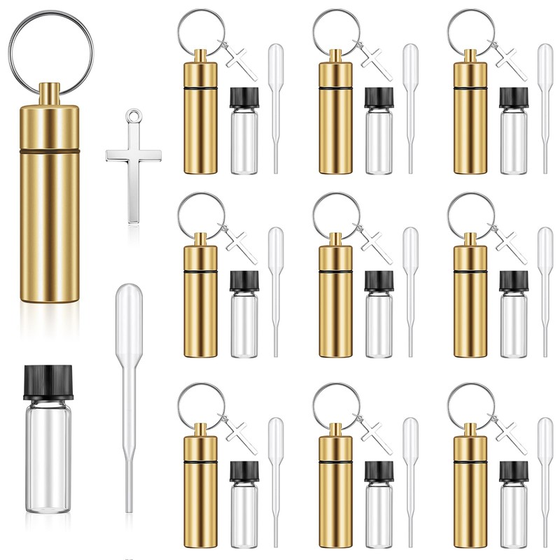 • Travel Friendly: with the included dispenser, it's easy to fill the miniature glass bottles with your oil and keep it within the protective aluminum keychain; This keychain adds convenience and can be attached to a purse, zipper, luggage, or a set of keys, making it easy to secure your treasured religious tools and have them at arm's reach during your travels