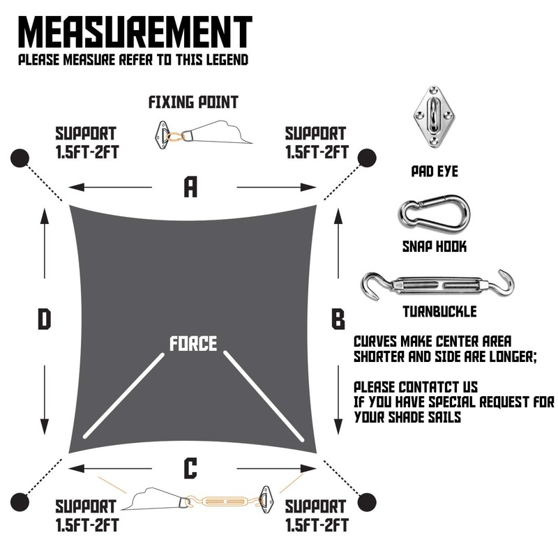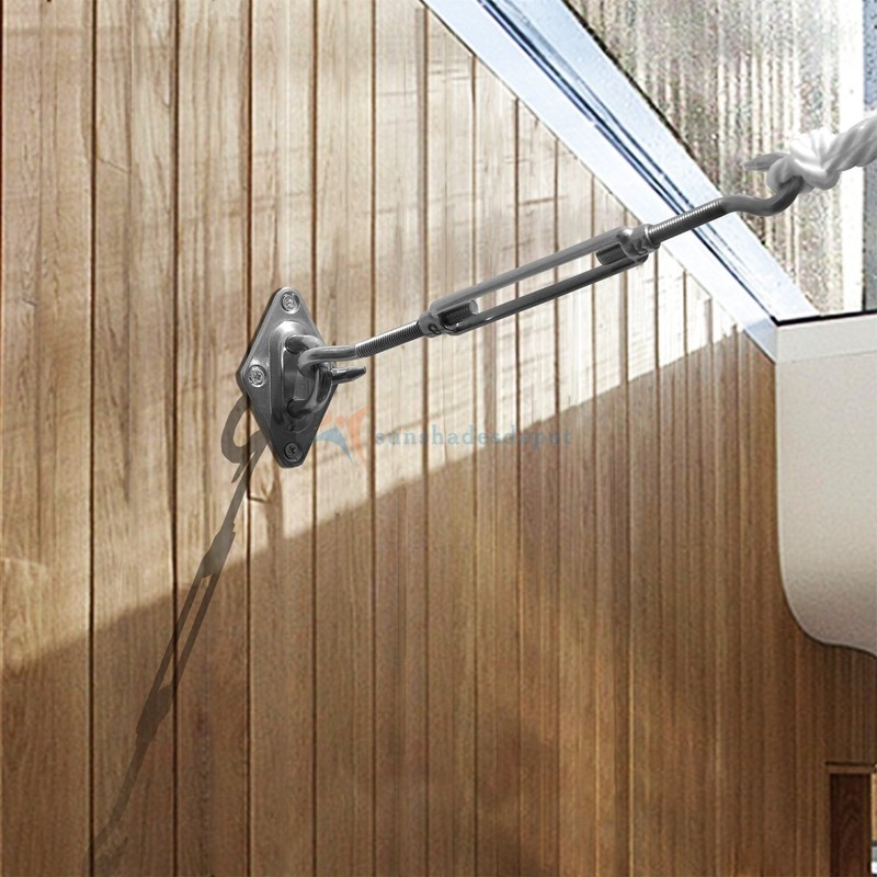 - PACKAGE INCLUDES: Tang Sun Shade Sail & Hardware Kit (turnbucklex 2pcs, Pad eye x 4pcs, Snap Hook x 2pcs, Screw x 16pcs) With the included accessories, the sunshade sail can be installed in any position. You can adjust the swivel buckle for better stability and more durability.