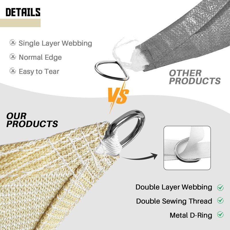 - STRUCTURE DESIGNED FOR DURABILITY: 20 FT PE ropes and Durable D-rings in each corner make the sun shade sail easy to attach to any sturdy connection point to provide sun protection and personal design where you need it. The HDPE fabric of the shade sail can shrink slightly, it needs a tolerance of ±6 inch for each side.