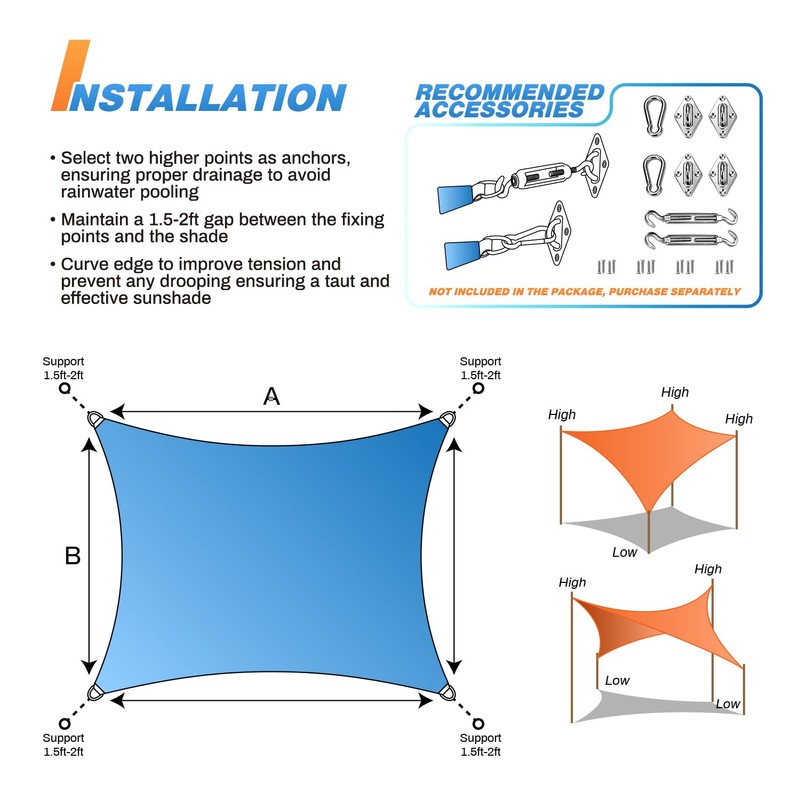 - ATTENTION: Our shade sails have curved sides to enhance pull strength and prevent drooping; this can add 1"-8" to the side length. The middle center of the sail will be shorter in width due to curves. We support custom size service, if you need a straight edge, or receive a product with quality issues please contact us.