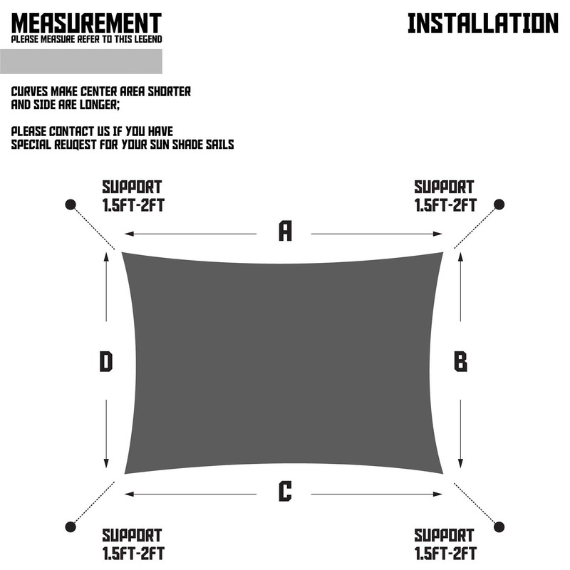 - Important: Our shade sails have curved sides to enhance pull strength and prevent drooping; this can add 1”-8” in side length. Middle-center of sail will be shorter in width due to curves. If straight sides are preferred please contact us. Read description for details.