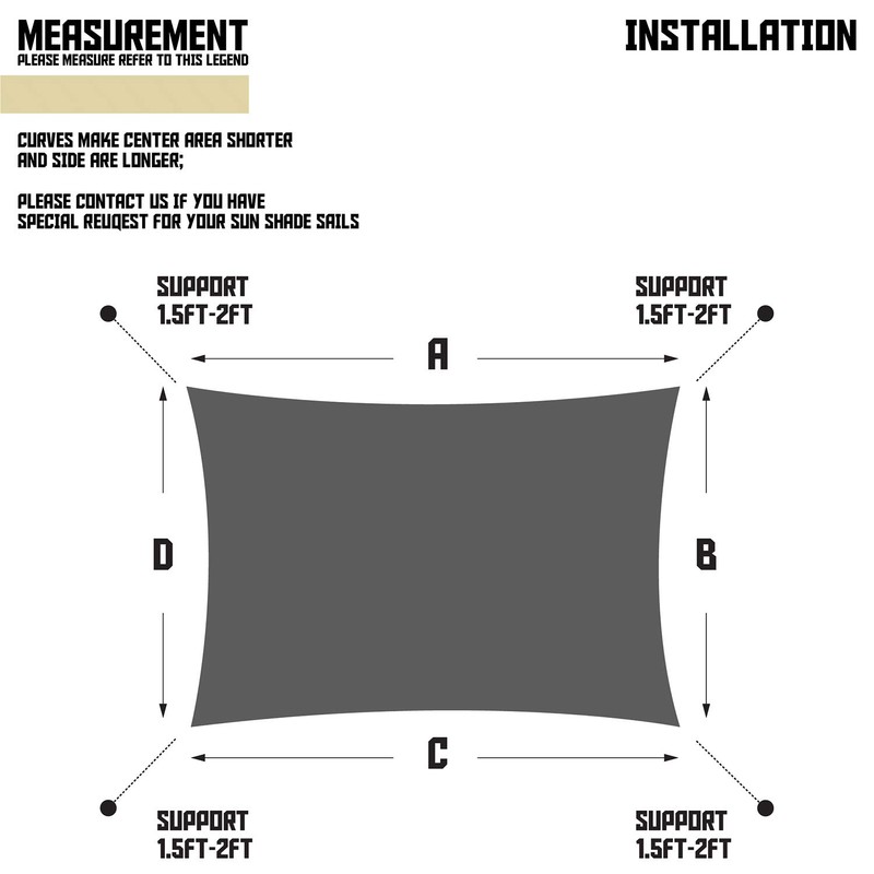 *Our sun shade sails have curves on each side to enhance pull strength and prevent drooping on the sides. Due to the curved sides on sun shade sails, the product may have 1-6 inches deviations on side length. For our hand-made products, deviations of 2 inches more or less is not uncommon. Thus, any deviations between 0 and 8 inches are acceptable for our products.