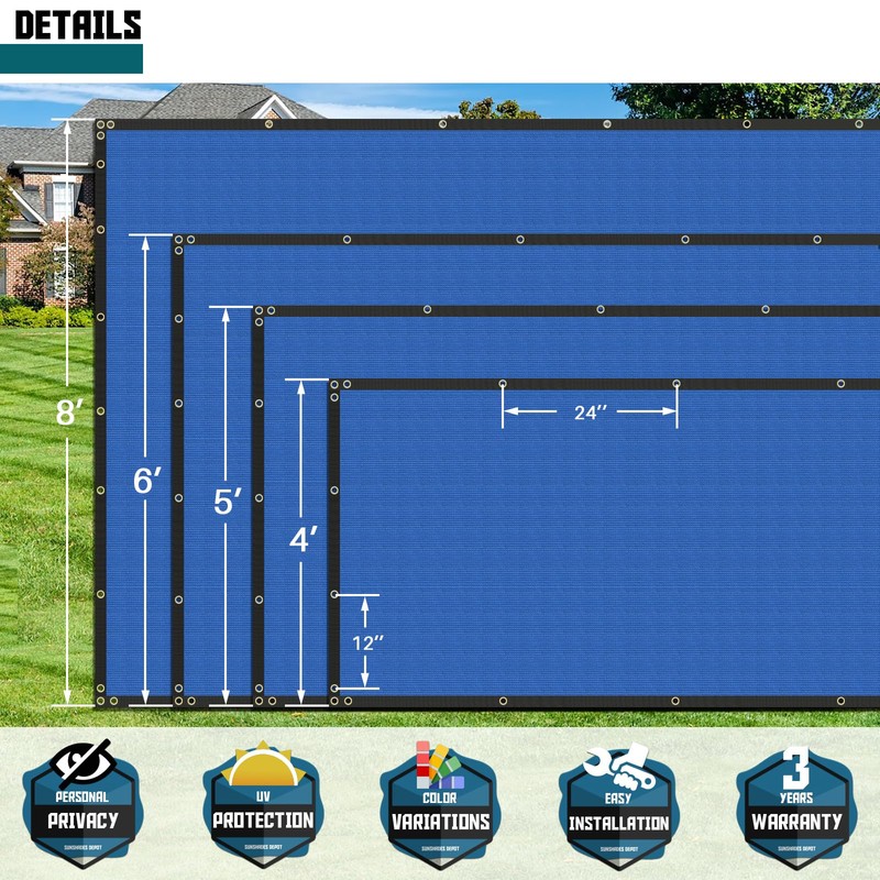 • 【SUPERIOR QUALITY MATERIAL】: Knitted with 100% High-quality pure polyethylene material, it can achieve 90% blockage to protect your privacy and block U-V, tear-resistant, air permeable; Unique patented of each corner has 3 grommets for reinforcement, keeps the fence in place even in extreme weather and no maintenance.