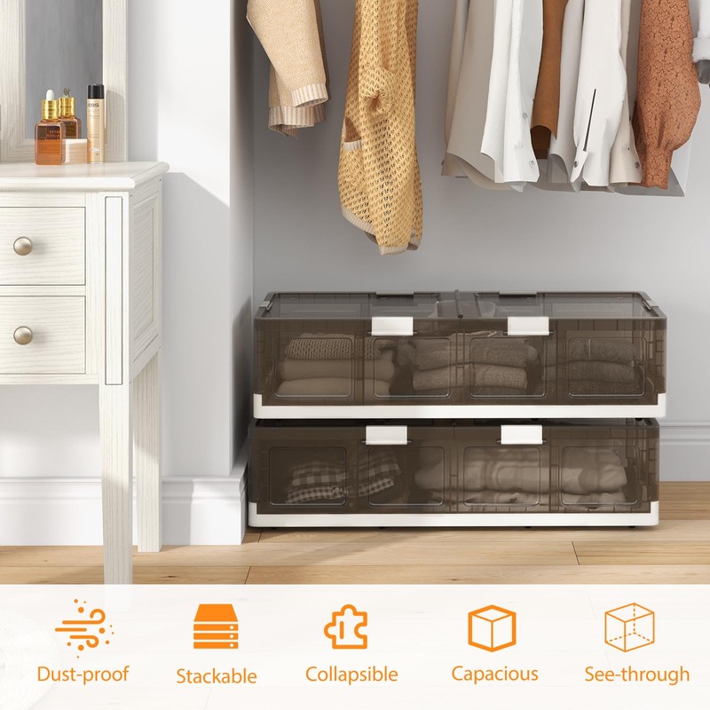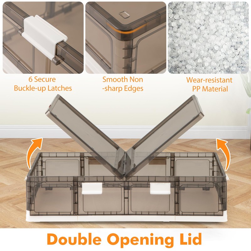 Constructed from anti-wear PP material, these containers are built to last. The dual-opening lids offer easy access from both sides, while the locking buckles ensure that the items inside are safely secured. With the smooth and quiet universal wheels, you can effortlessly move your storage bins from one room to another. The stackable design enables you to make the most of vertical space in your area. When not needed, these flexible storage bins can be collapsed to save space, making them perfect for compact living spaces such as small apartments, dormitories, closets, or corners of bedrooms.