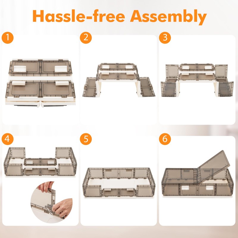 - Stackable & Collapsible Design: As the innovative lids are recessed, you can stack multiple containers on top without slipping or wobbling. When not in use, the storage bins can be folded and put away. And for assembly, just unfold the folded panel and fix it to the snap position.