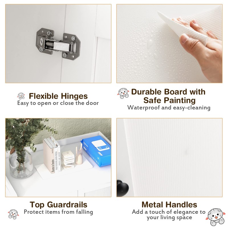 Our stylish modern cat furniture cabinet features a chic all-white appearance and clear lines, which can not only be a practical cat washroom to hide cat litter boxes, but also can be a perfect addition to your home decor. It is perfect for kittens to enjoy private potty time and allow them to find a sense of security and belongings in the enclosed environment. Besides, we also provide a cat scratching pad, a winding entry, and a side entrance, giving your furry friend more fun. More than that, the divider and side entrance can be installed on the right or left according to your room layout. You can also remove the divider to create a large interior space. It measures 29.5” x 20” x 21” (L x W x H) and the interior measures 19” x 18.5” x 15.5” (L x W x H), please measure the size of the cat litter box before purchase.