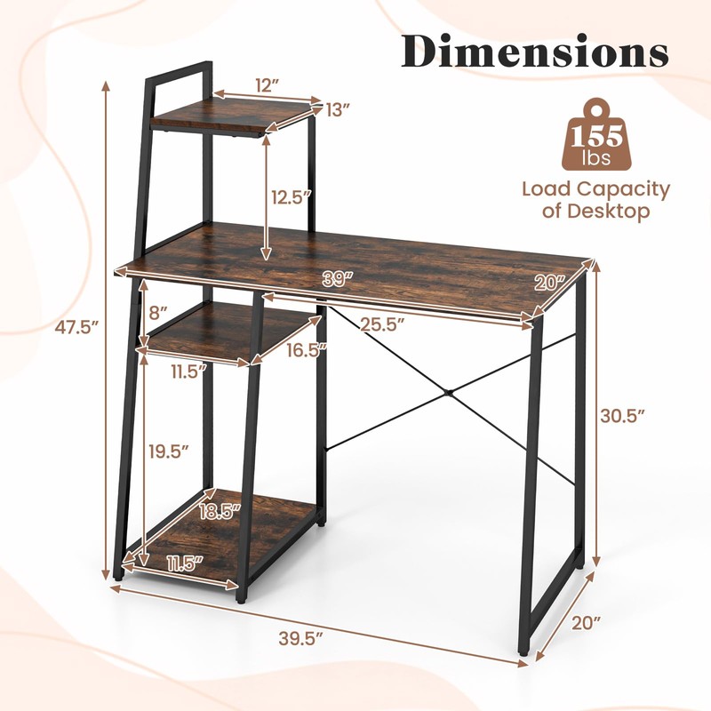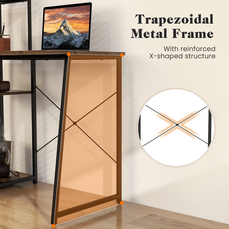 Tangkula Computer Desk with Shelves, Space Saving Home Office Desk with 3-Tier Ladder Shaped Storage Bookshelf, Modern Writing Study Desk with Metal Frame, Compact Computer Workstation (Rustic Brown)