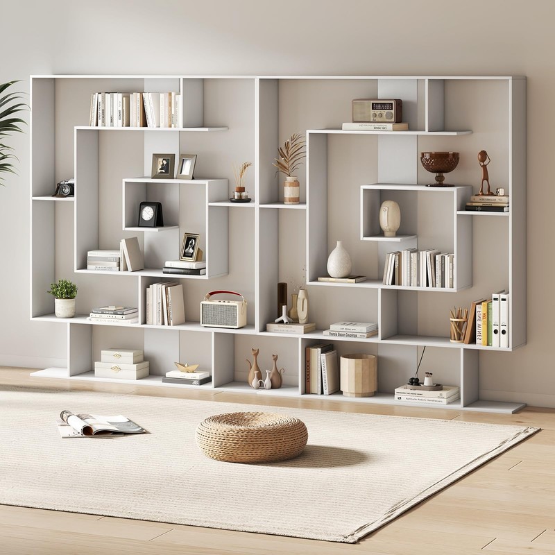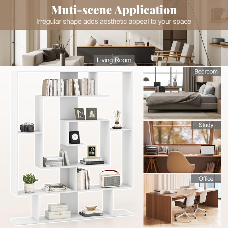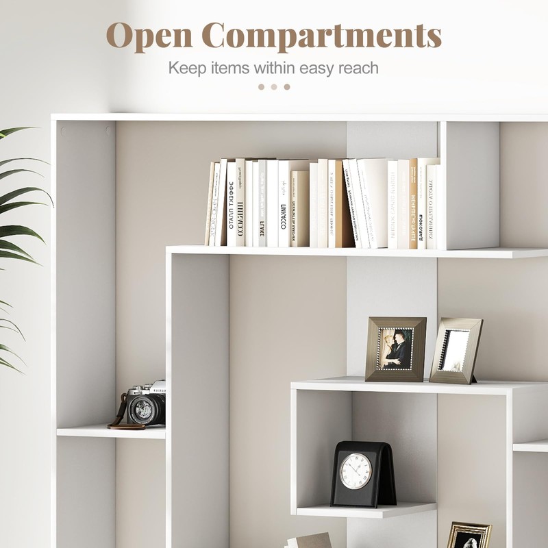 Transform your space with this modern bookshelf, designed to combine functionality and style. Its irregular shape and open compartments provide ample storage for books, ornaments, and plants, creating an eye-catching focal point in any room. Crafted from engineered wood with a reinforced back panel and non-slip foot pads, this sturdy bookcase ensures long-lasting durability. The included 2 anti-tip kits allow you to secure the bookcase to the wall for added stability and safe use. Perfect as a display shelf or organizer, this freestanding unit enhances living rooms, bedrooms, offices, and study areas with contemporary elegance and practicality.