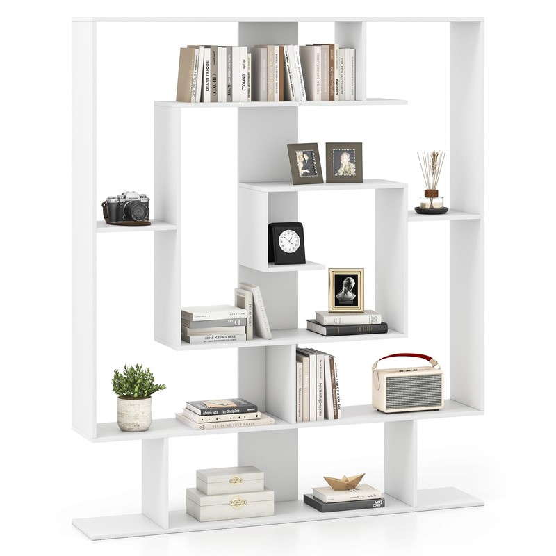 Tangkula Irregular Wooden Bookshelf, Geometric Bookcase w/Open Compartments & 2 Anti-Tip Kits, Decorative Freestanding Display Shelf, Modern Storage Organizer for Living Room, Office (White)