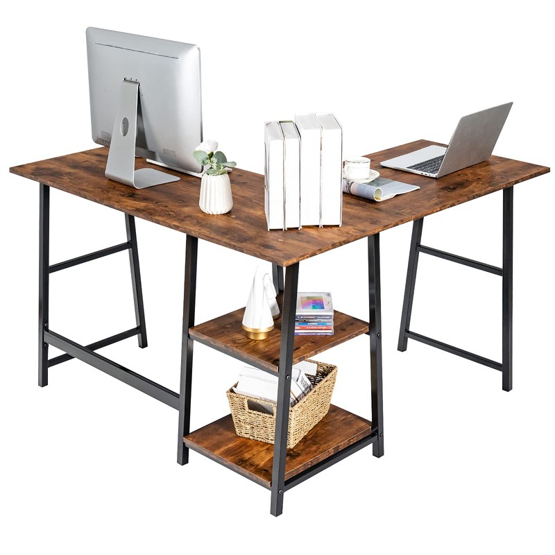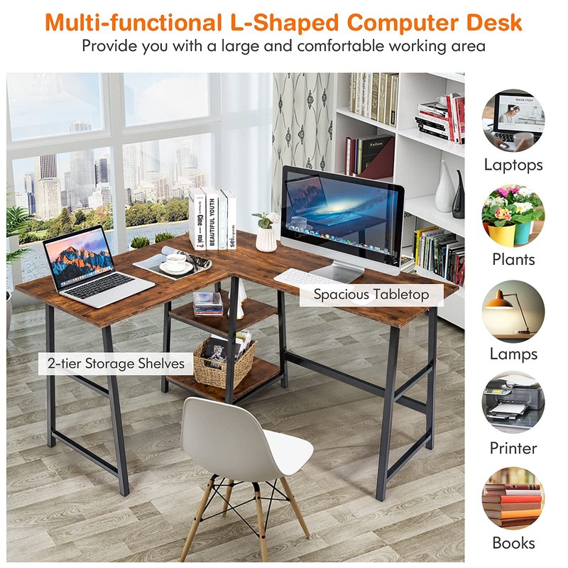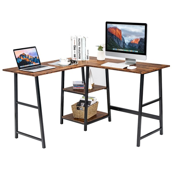 Tangkula L Shaped Desk, Space Saving Corner Desk w/ 2 Tier Storage Shelves, Study Writing Desk Workstation with Reinforced Metal Frame, Home Office Desk (Rustic Brown)