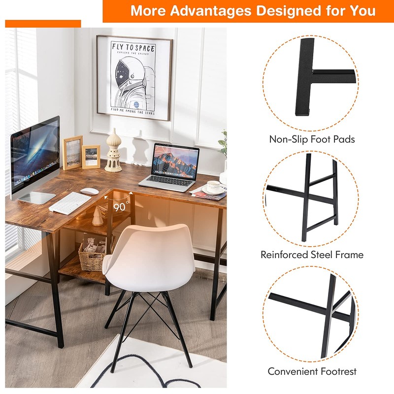 Are you looking for a versatile L-shaped office desk which keeps your work space tidy and improves your working efficiency? Our L-shaped desk with shelves will be your ideal choice! The large tabletop and detachable shelf maximize the satisfaction of your different storage needs and create a comfortable working environment for you. Supported by heavy duty steel construction, our computer desk is sturdy enough to support all kinds of belongings. Thanks to the additional cross bar, you can relax your legs and feet in a comfortable position. With a compact l shaped frame and minimalist style, this study workstation can be put in a lot of limited place. It is suitable for reading, working, reading, playing games and so on. Get more enjoyment from this computer desk.