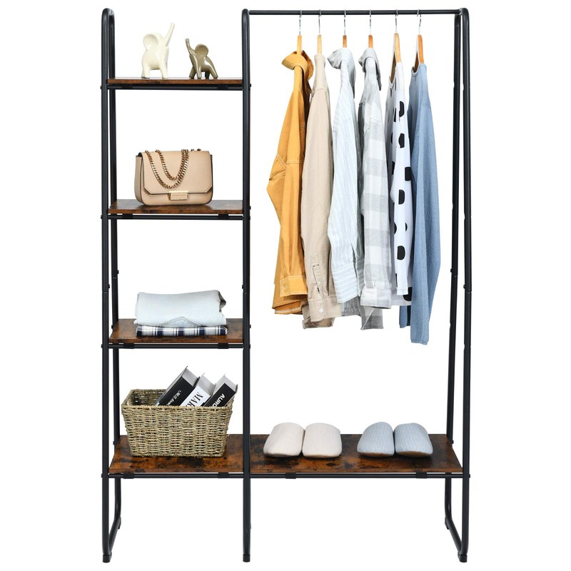 - 👔【2-in-1 Design with Large Space】👔 Featuring 4 storage shelves, the garment rack will provide spacious space for your clothes, shoes, bags and keep them in order. And a built-in clothes rod with enough height is convenient for hanging overcoats or dresses.