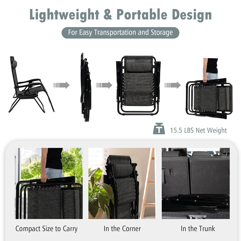The design highlight of this folding lounge chair is adopting zero gravity design. It really makes you feel relaxed and when it reclines back, it really does feel like zero gravity. Our outdoor recliner can be adjusted from a vertical position to the maximum angle of 160 degrees and you can sit on the patio chair, close your eyes, then taste the peace and cozy of nature! Adopting the exquisite breathable fabric and come with a sturdy steel frame, this folding reclining lounge chair is durable for a long life span, lightweight for easy carry, and convenient storage. Meanwhile, a side cup holder tray to place beverages, magazines, phone,s or other small items for convenient accessibility. A great helper to suit different activity scenarios like a deck, porch, poolside, garden, and yard for relaxation!