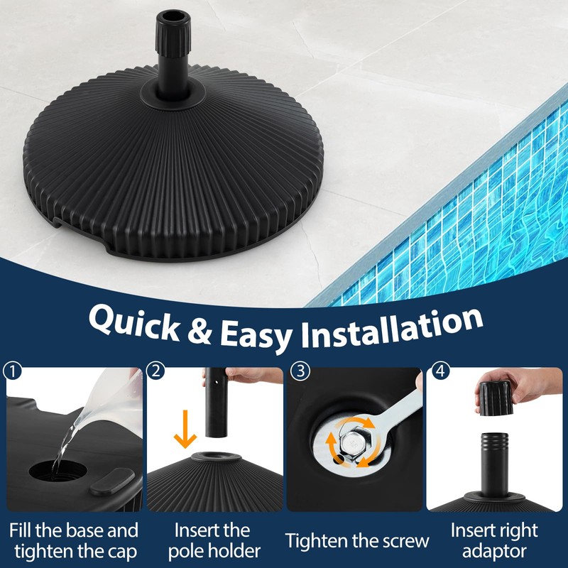 Enhance your outdoor experience with our premium patio umbrella stand. This stand features a refillable heavy-duty reservoir that can be filled with water or sand to ensure exceptional stability. The stand is equipped with 3 sizes of pole adapters (Φ1.26 inch/32mm, Φ1.34 inch/34mm, and Φ1.5 inch/38mm) to fit 6ft, 7.5ft, and 10ft market umbrellas, ensuring compatibility with most umbrella poles. Additionally, crafted from high-quality HDPE material, this umbrella stand is crack-resistant, impact-resistant, and built to last. Its unique shell texture and raised pad design add a touch of elegance and stability to your outdoor space.