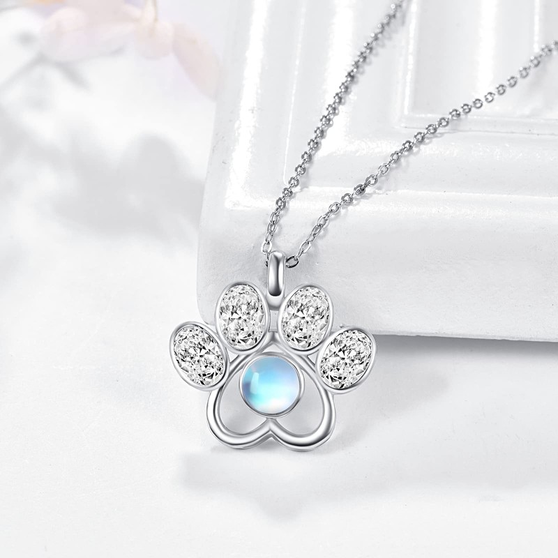 TANGPOET Dog Paw Necklace 925 Sterling Silver Moonstone Dog Print Pendant Cubic Zirconia Necklace Jewellery Gifts for Women Ladies Girls