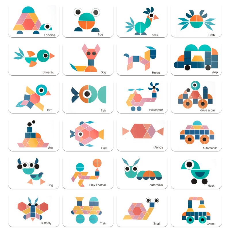 - Bunte Musterblöcke: Geometrische Puzzles umfassen 12 verschiedene Formen und Farben von Blöcken und 48 künstlerische Muster. Kinder können diese Blöcke zum Platzieren, Stapeln oder Sortieren verwenden und auch beliebige Formen, Tiere, Fahrzeuge, Blumen, Boote usw. erstellen.