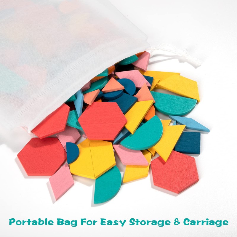 - Vorteilspaket: Sie erhalten 180 Tangram-Puzzleblöcke aus Holz und 24 doppelseitige Designkarten. Zum einfachen Transport und zur Aufbewahrung ist eine Tasche mit Kordelzug im Lieferumfang enthalten. Es gibt unzählige Möglichkeiten, mit diesem Set zu spielen und wunderschöne Muster und Kunstwerke zu erstellen.