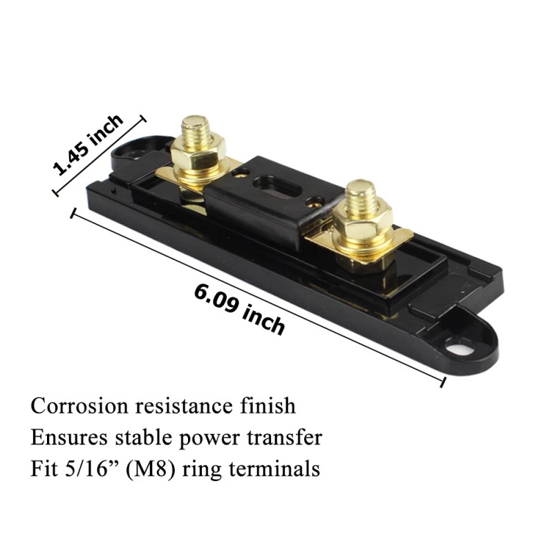 The AGU fuse holder is waterproof and has a corrosion-resistant finish for durability.High-temperature housing base provides melting resistance during high-voltage power transmissions.Nickel plated AGU fuse ensures safety and maximum current power delivery and effectively upgrades your car audio system and protect your sound.