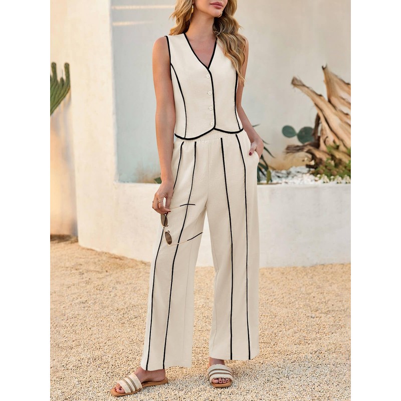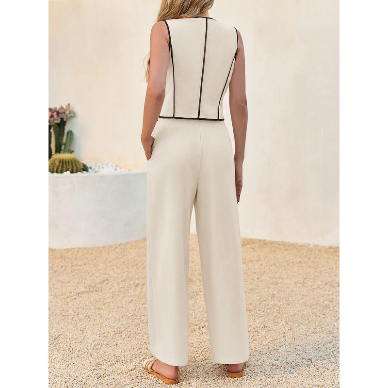 Tankaneo Womens 2 Piece Outfits Linen Sets Sleeveless Button Vest Wide Leg Pants Matching Lounge Set