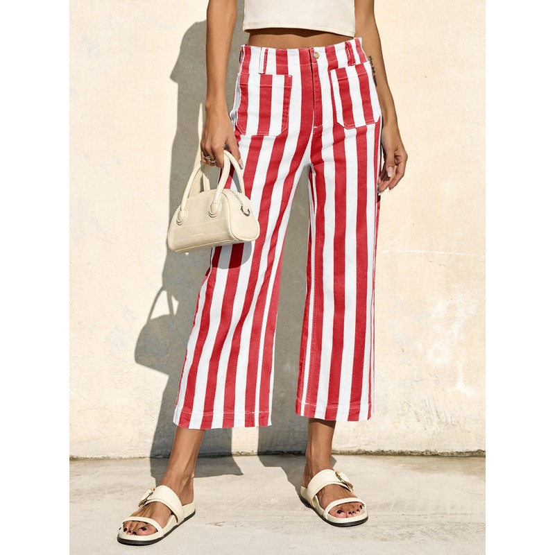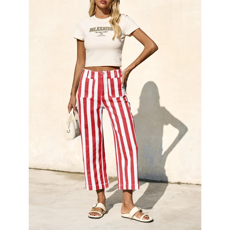 Tankaneo Womens Cropped Striped Jeans Casual High Waisted Stretchy Straight Leg Denim Pants with Pockets Red