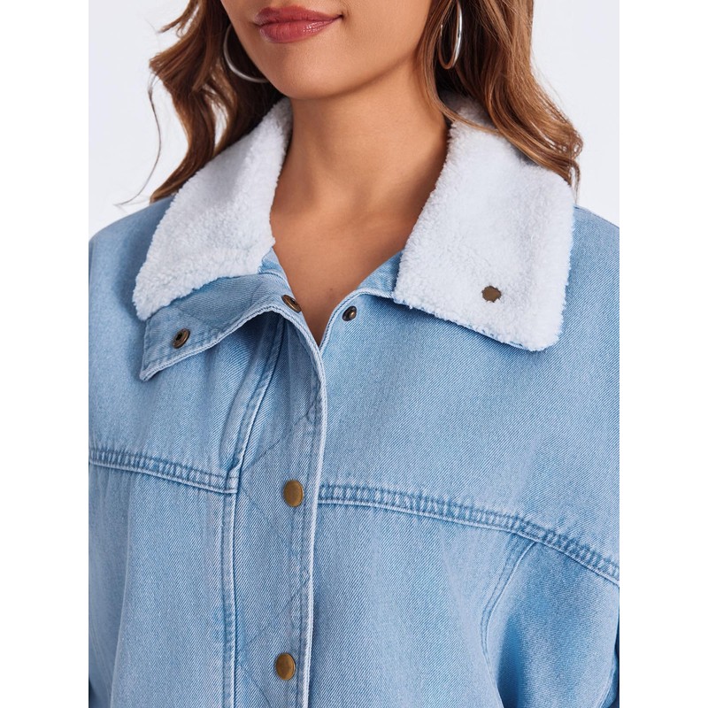 - Feature: Oversized denim jacket, long sleeves, buttoned cuffs, snap button closure, elasitc hemline, cover hip length and two side slant pockets for hand to hold your phone, wallet and keys; sherpa collar for added warmth, can protect you from coldness as down coat, basic denim blue color