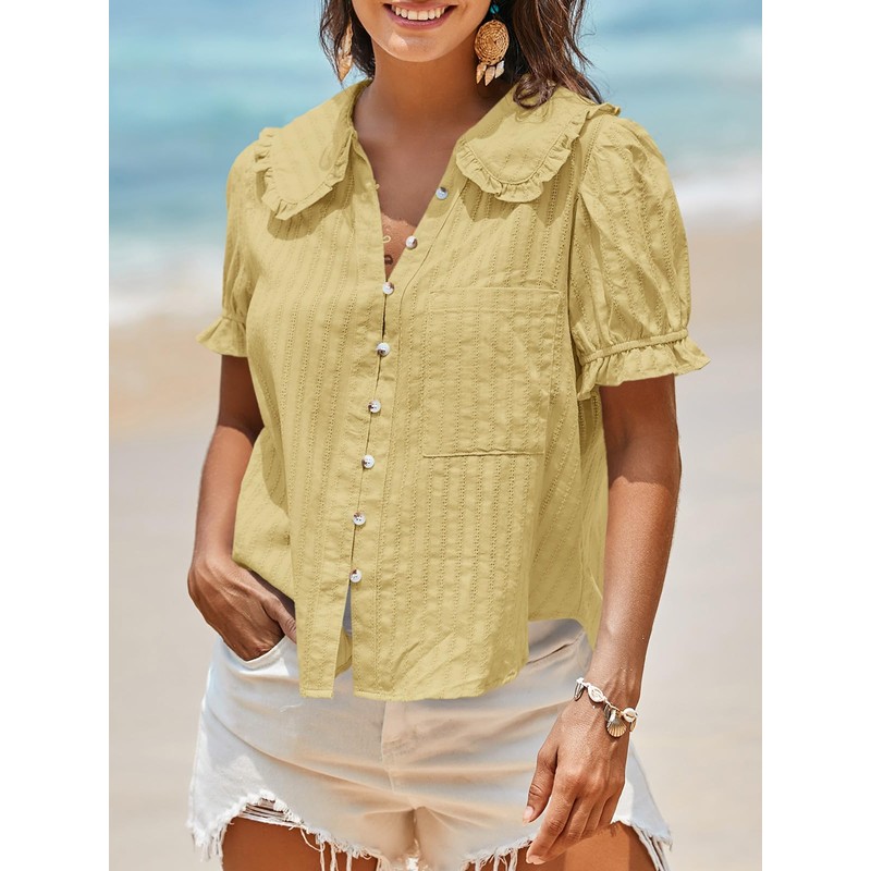 Tankaneo Womens Puff Sleeve Shirts Peter Pan Collar Button Down Cotton Blouse Casual Summer Textured Tops Dark Yellow